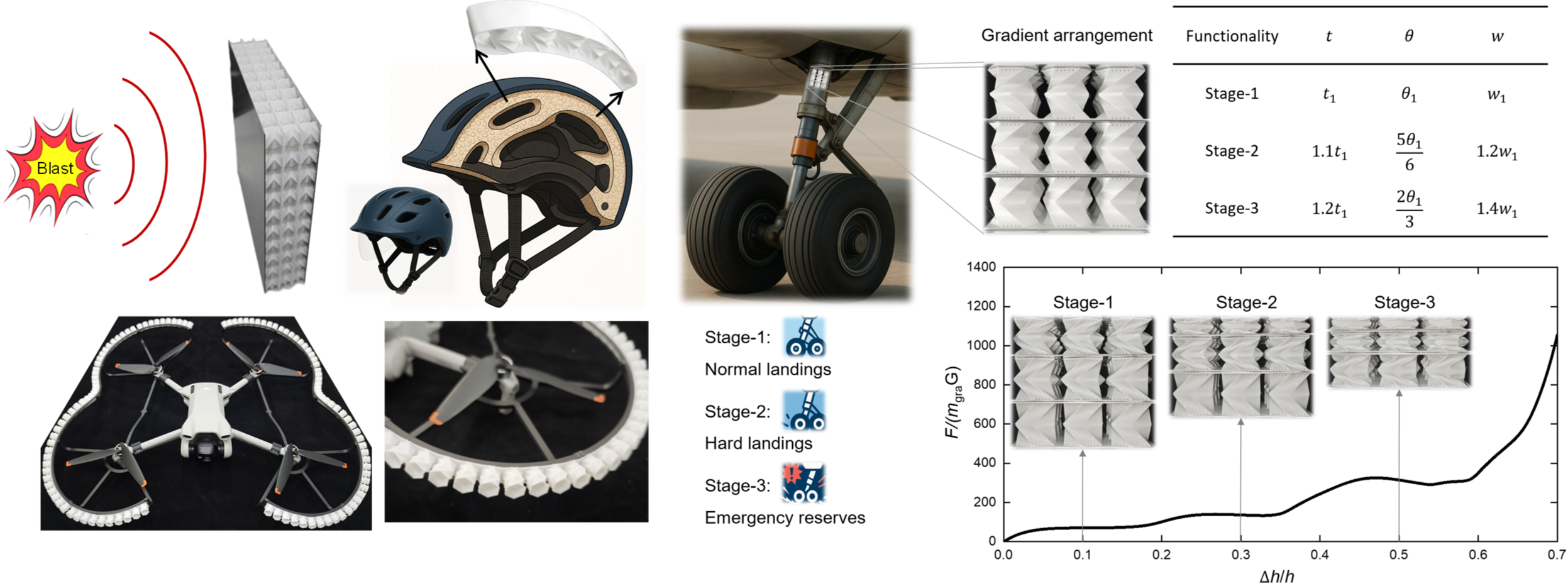 凭借“高效率-高吸能-轻量化”的综合优势,CMCS超材料有望在提高防护等级的同时有效降低结构质量,减小冲击传递,提升装备/结构的安全性与可靠性,在车辆/建筑防护层、头盔悬挂系统、无人机缓冲结构、飞机起落架吸能组件等工程场景中具有广阔的应用前景。